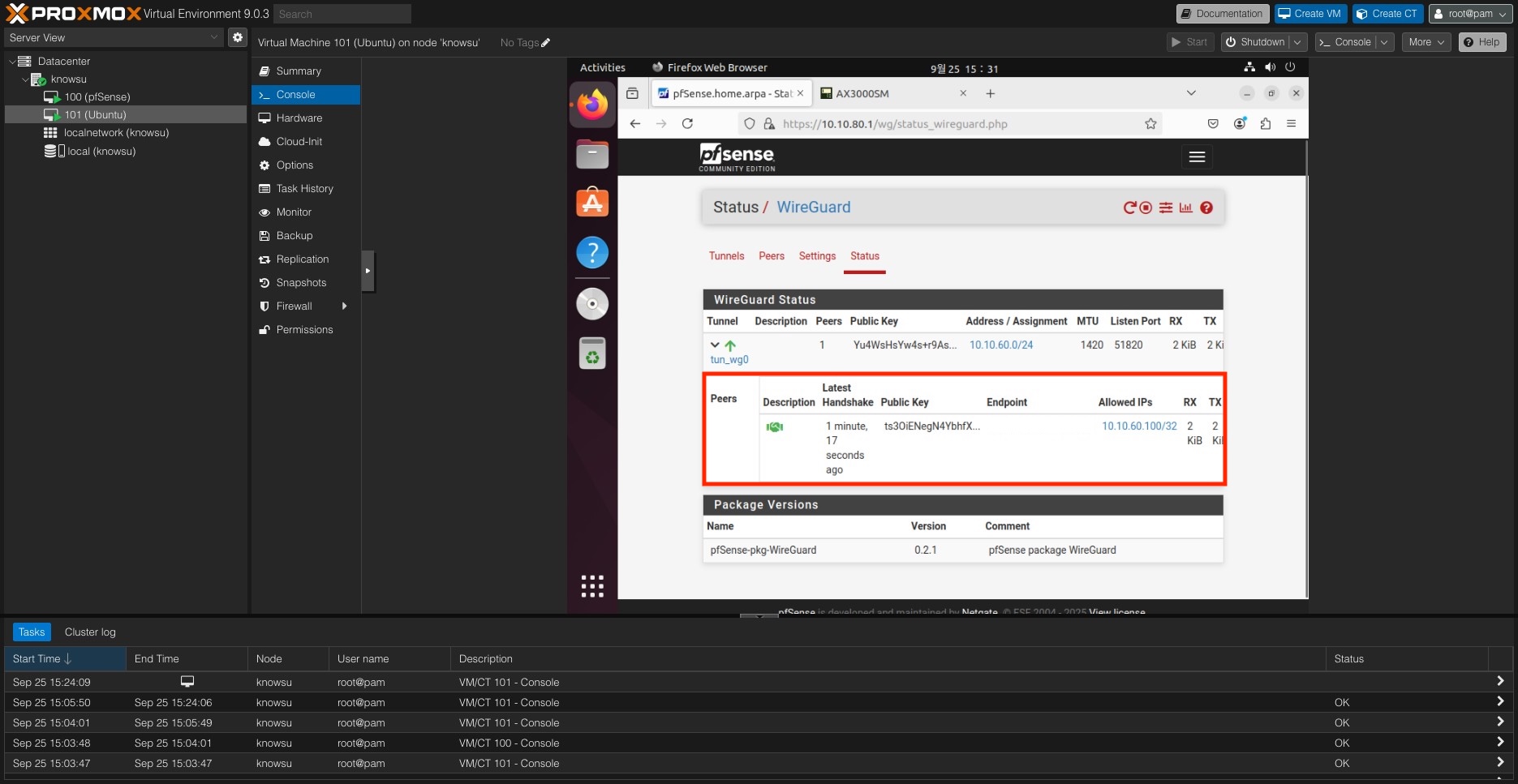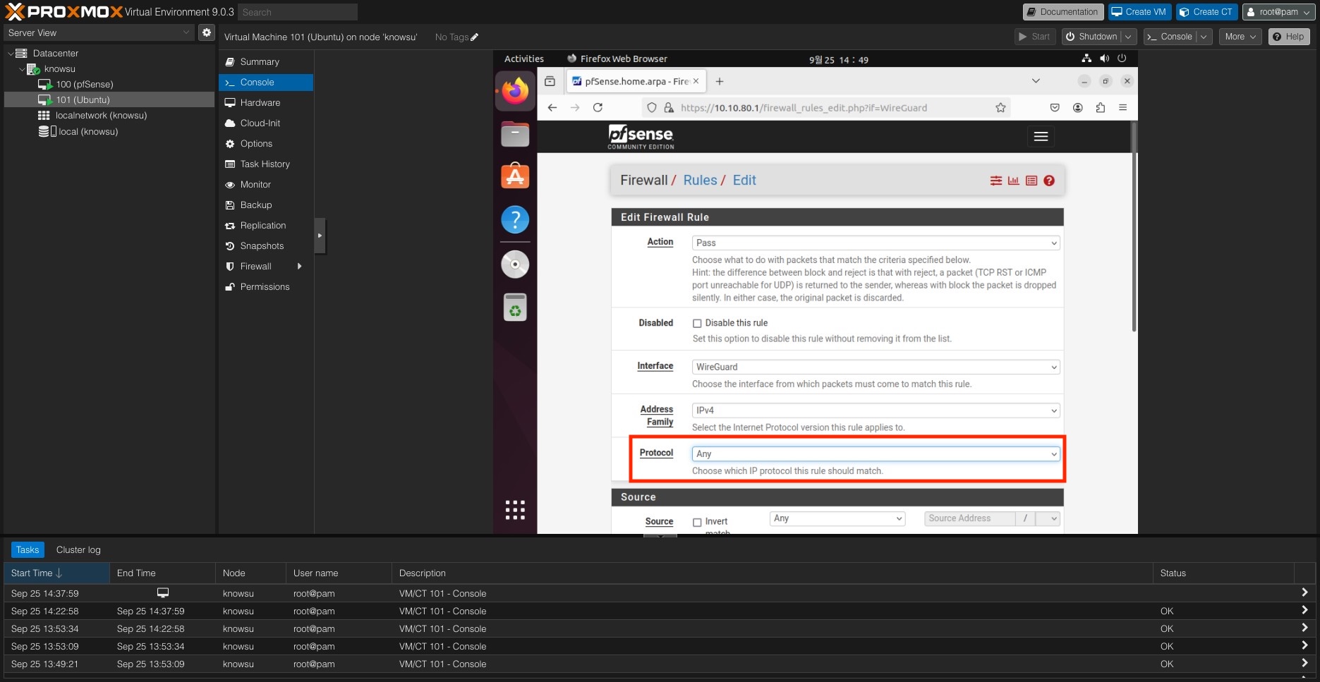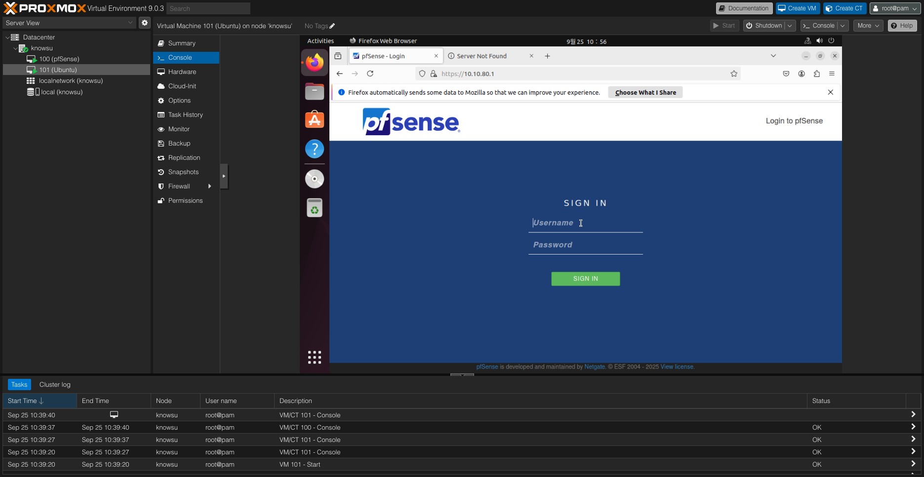 이제 해당 브릿지(vmbr1)를 사용하는 Ubuntu VM을 하나 띄워보면 pfSense GUI도 접근이 가능하다.