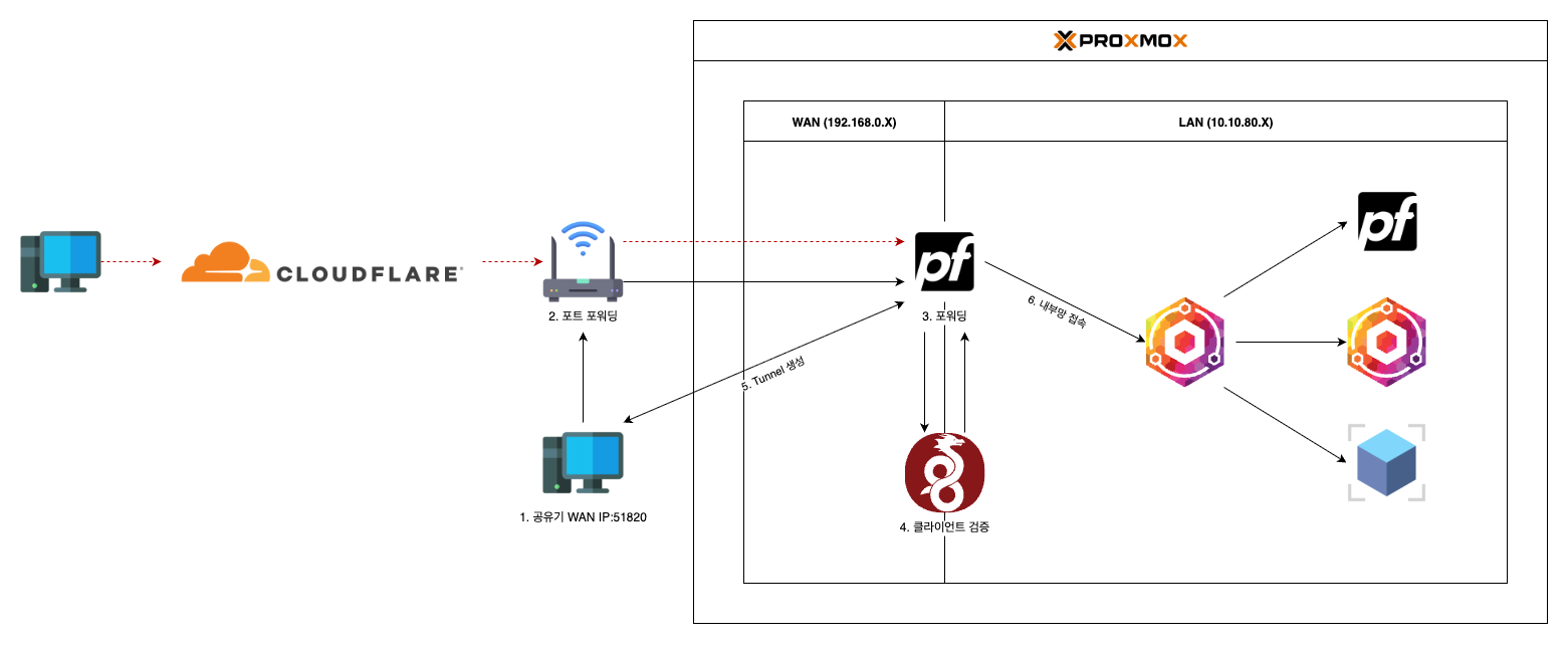 Cloudflare > 공유기 공인 IP > pfSense > NPM(Nginx Proxy Manger) > 내부 서비스