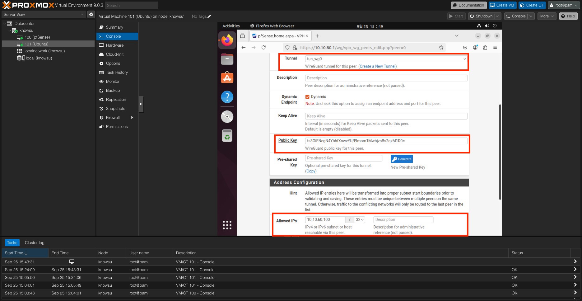 해당 페이지에서 터널이 사용할 IP 대역(10.10.60.0/24)과 터널에 연결될 Peer가 사용할 공개키를 생성해 주었다.