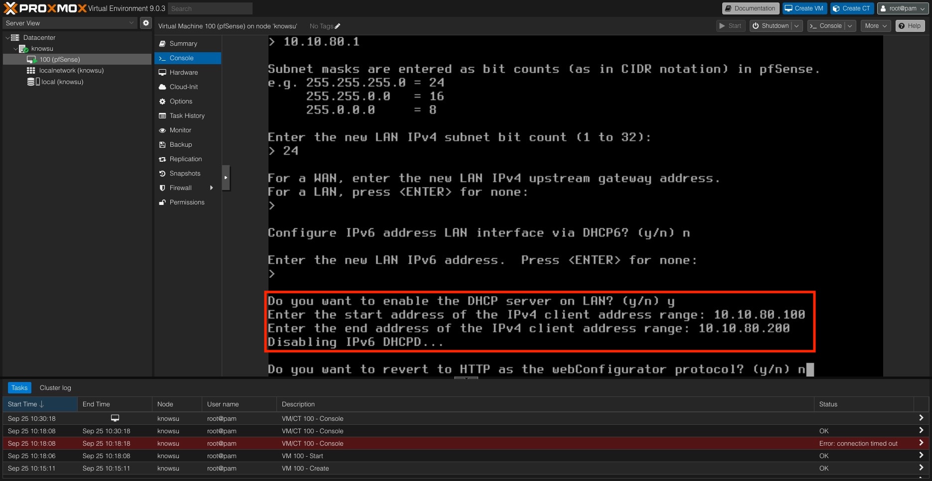 참고로 설치 과정에서 pfSense를 LAN 대역의 DHCP 서버로 쓸 거냐고 물어보는데,