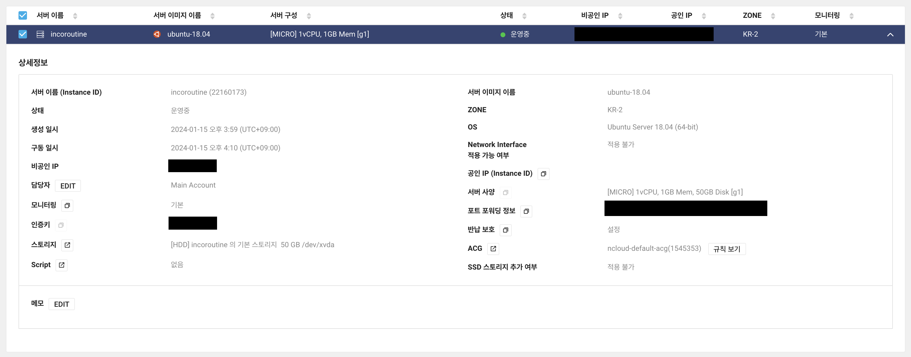 상기 작업은 외부 20001번 포트로부터의 접근을 내부 22번 포트로 포워딩해주기 위한 작업이다. 이후 20001번 포트를 외부 IP에서 접근할 수 있도록 ACG에서 허용해주어야 한다. ACG는 일종의 방화벽으로, NCP에서 제공하는 IP 기반 필터링 기능이다. 본 글에서는 추가로 이후의 DB 접근을 위한 20002번 포트를 개방해주었다.
